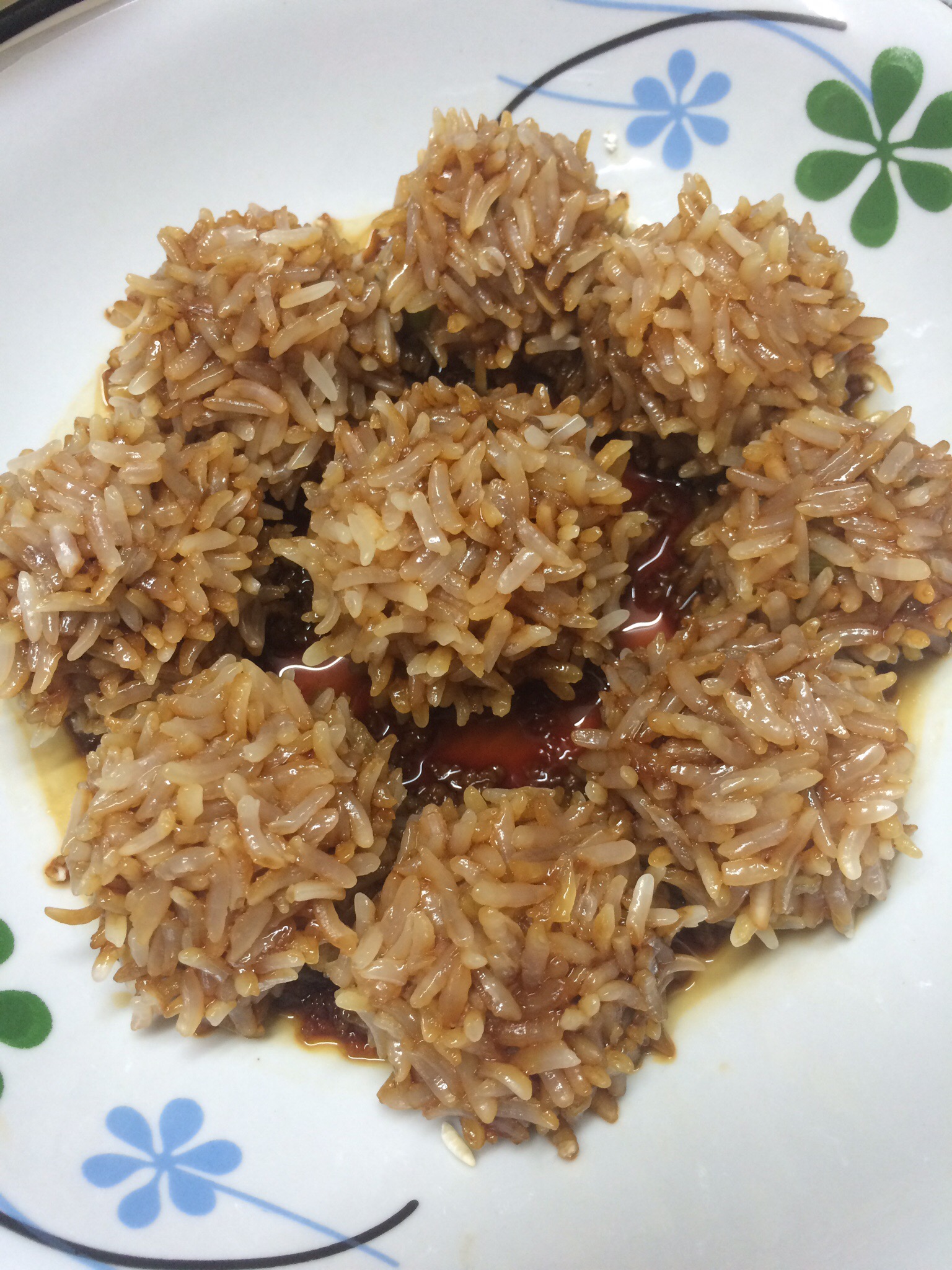 4. Let small meat balls roll in the sticky rice until they are fully coated with sticky rice.让肉丸在糯米里滚动直到外面沾满一层糯米。