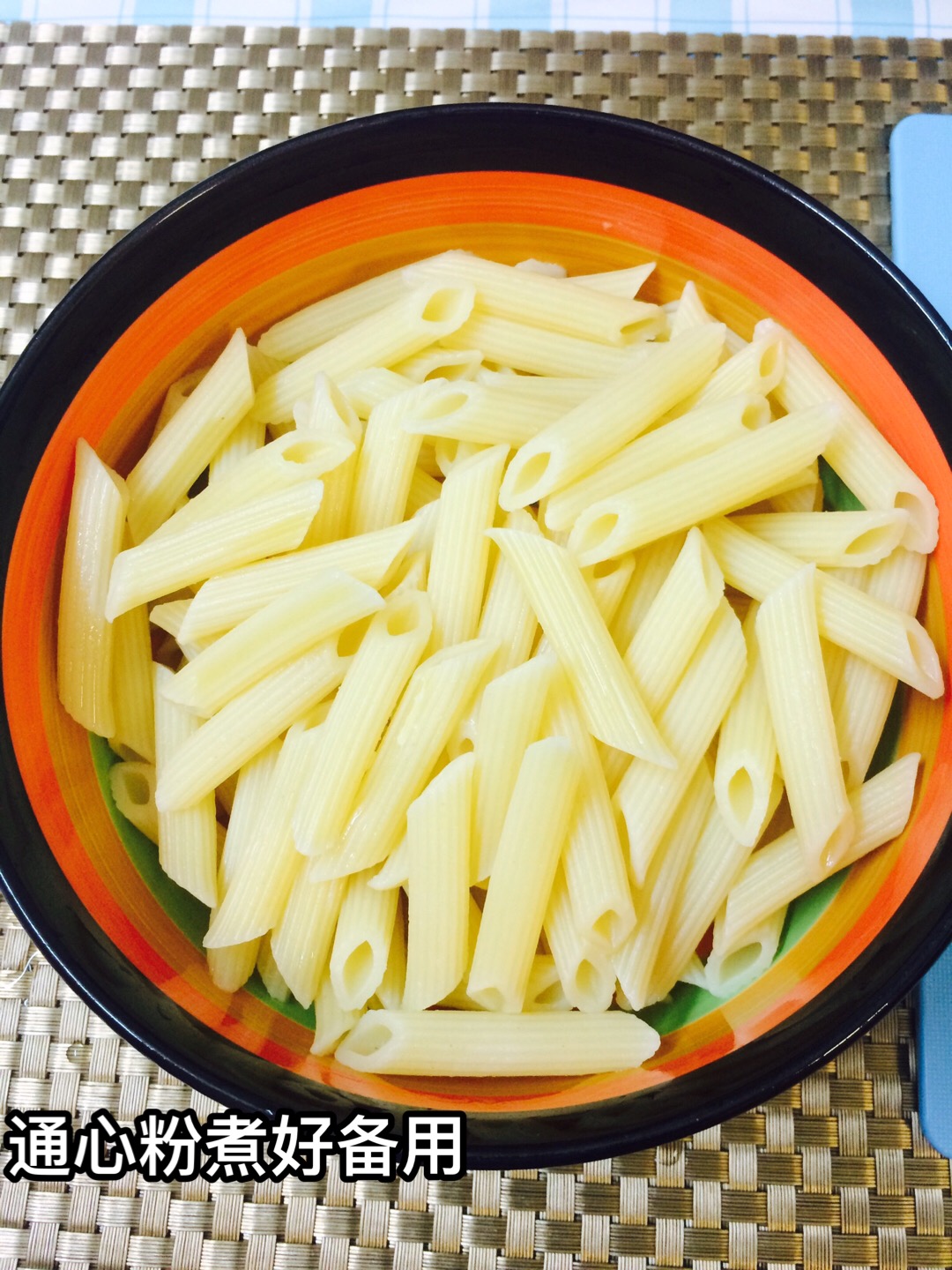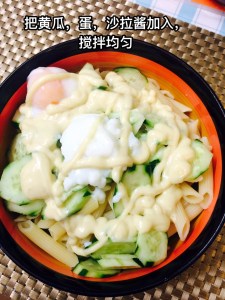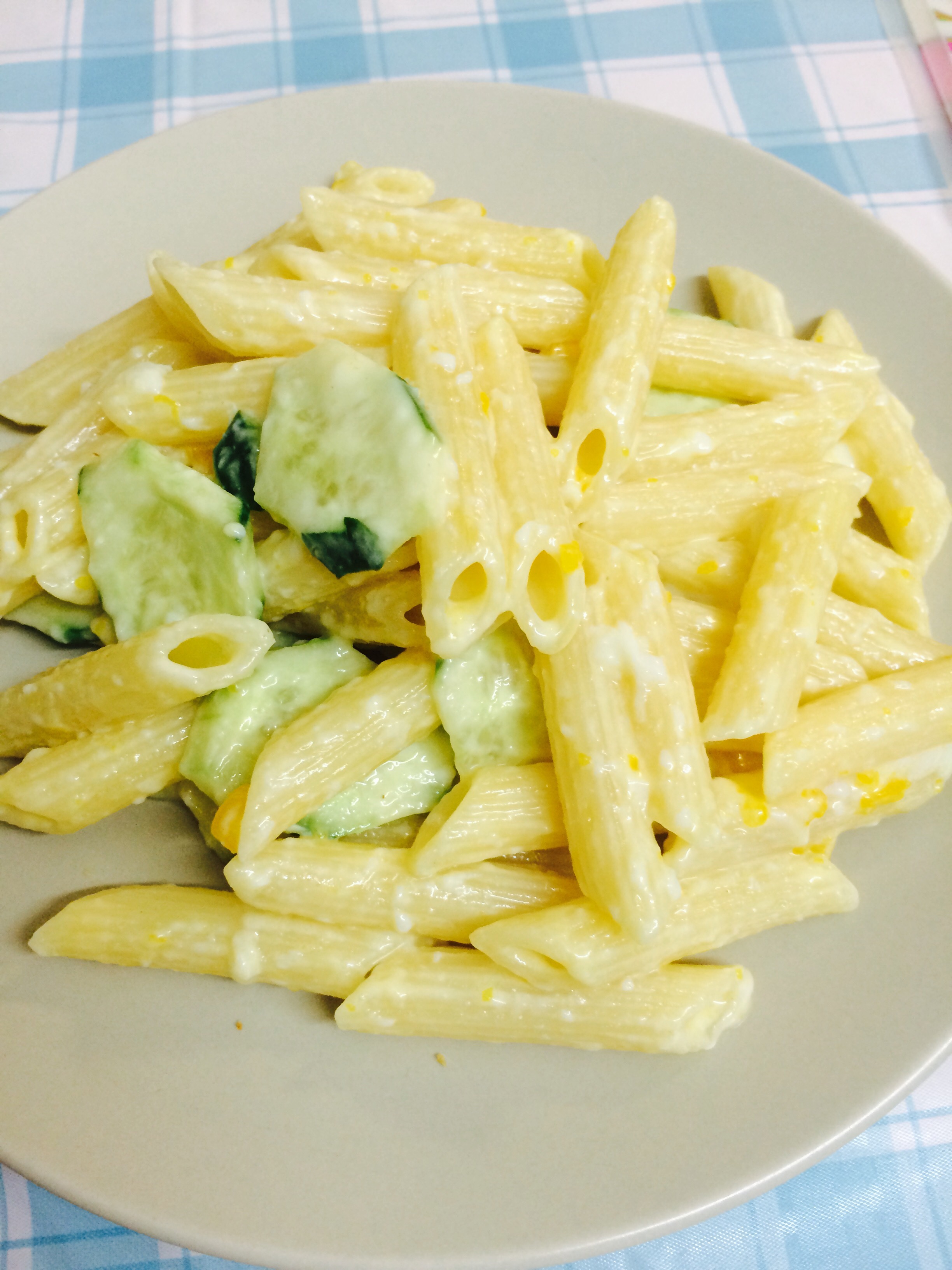 Mix the penne with cucumber slices, half boiled egg, and salad cream.