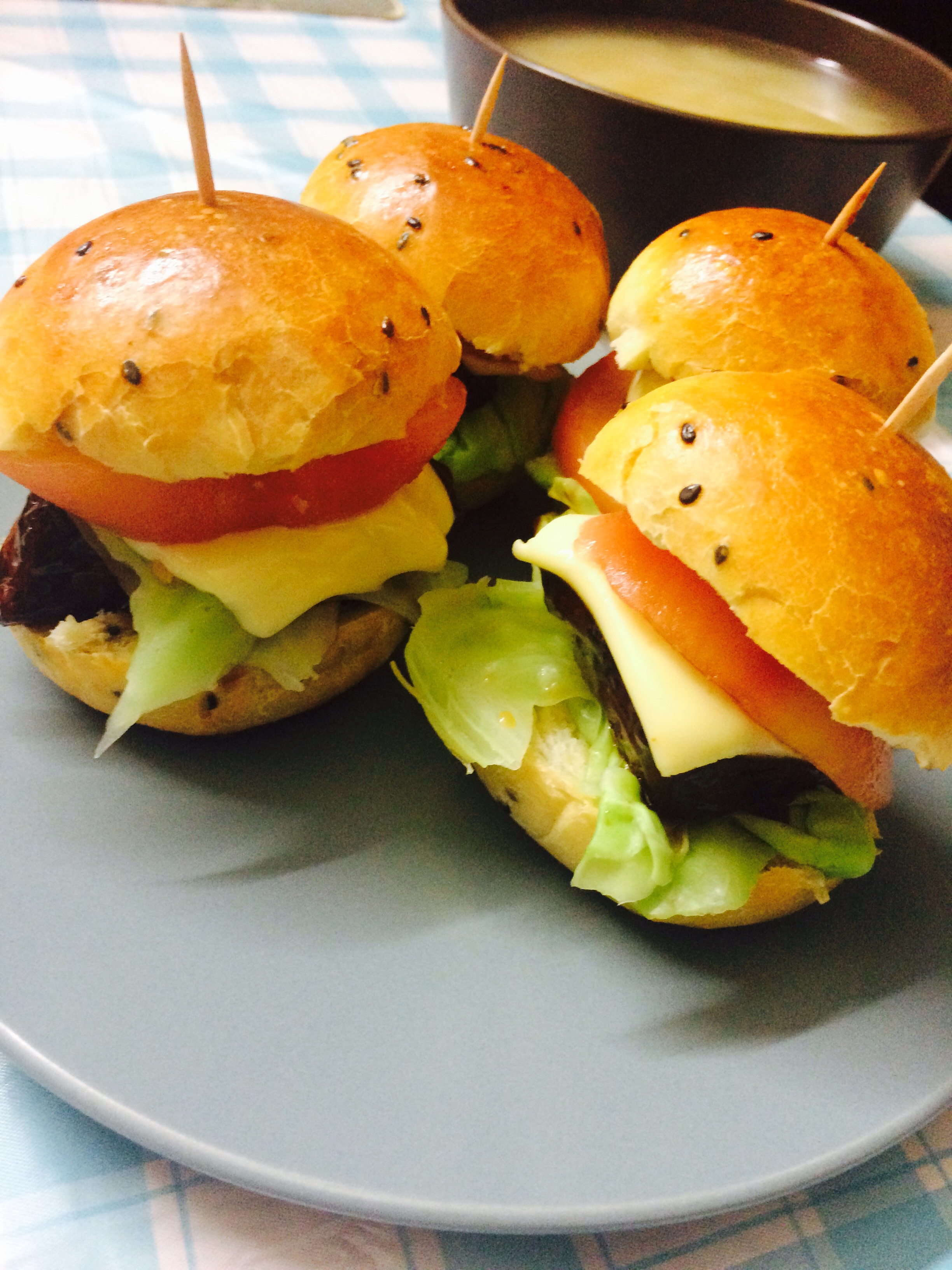 I cut the round bun into two parts. In the middle I put carriage, tomato slice, cheese and pork chop. And make them mini-hamburgers.