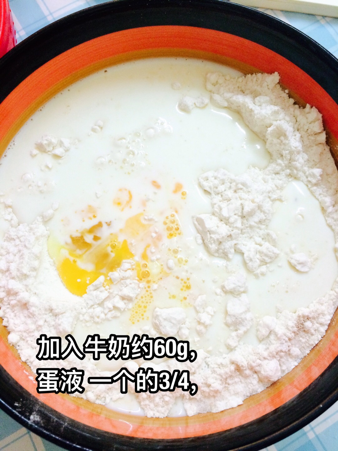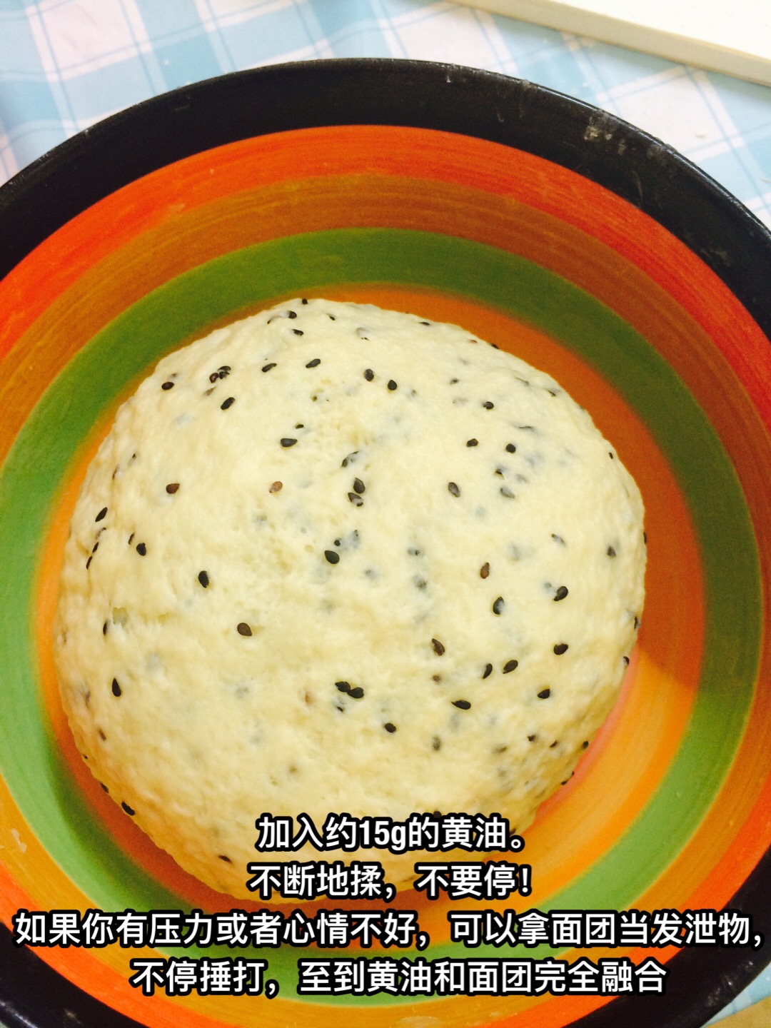 Add in 15g butter. Just knead, knead and knead. If you are really stressed out recently, it’s a good way to release your negetive energy outwardly. You can even punch the dough. When the butter is completely absorbed by the dough, you can stop and take a rest. Kneading really takes a while.
