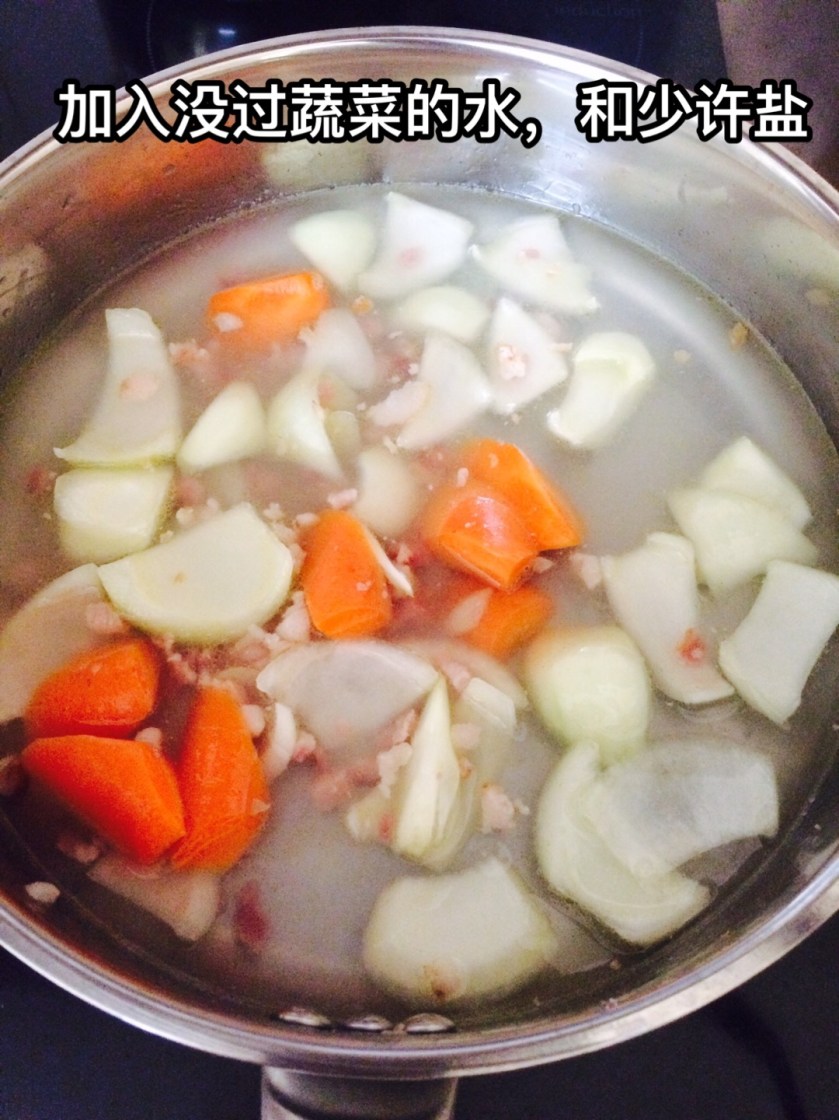 Put the smashed mixture of vegetables back into the pan. Heat it again. Because the smashed mixture is very condensed, you can add in some water.