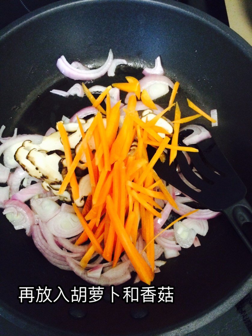 Chop onion, shiitake,bell pepper and carrot into thin slices.