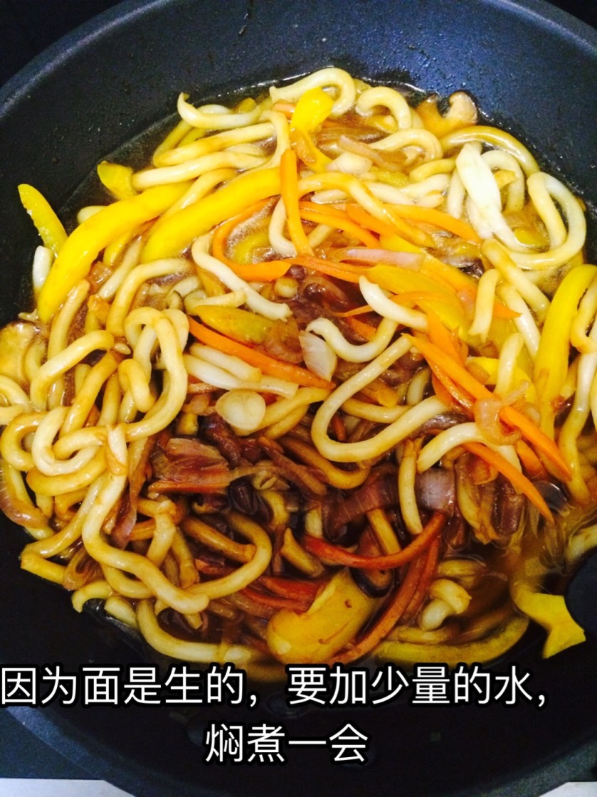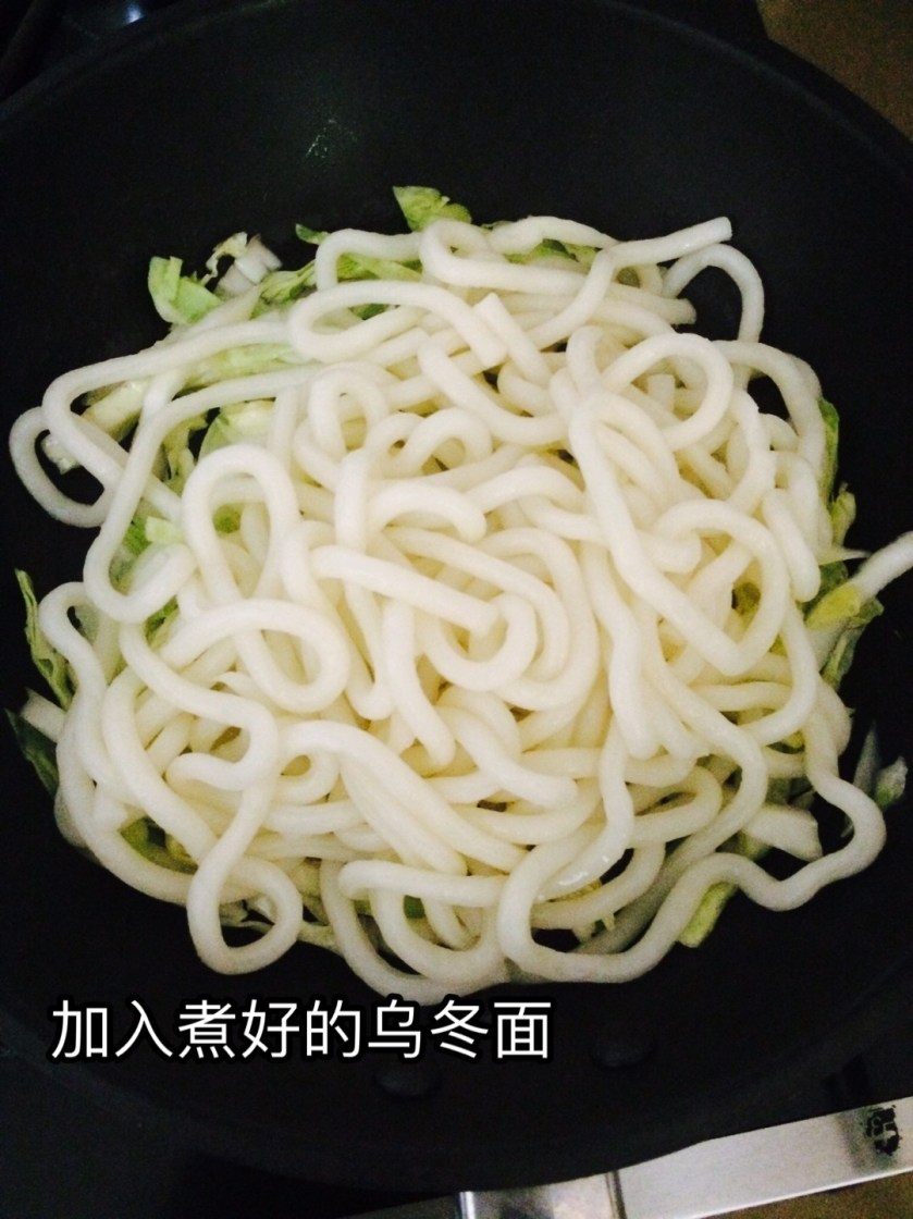 Then add a little water. Because the udon is uncooked, so it should be braised for 2-3 minutes.