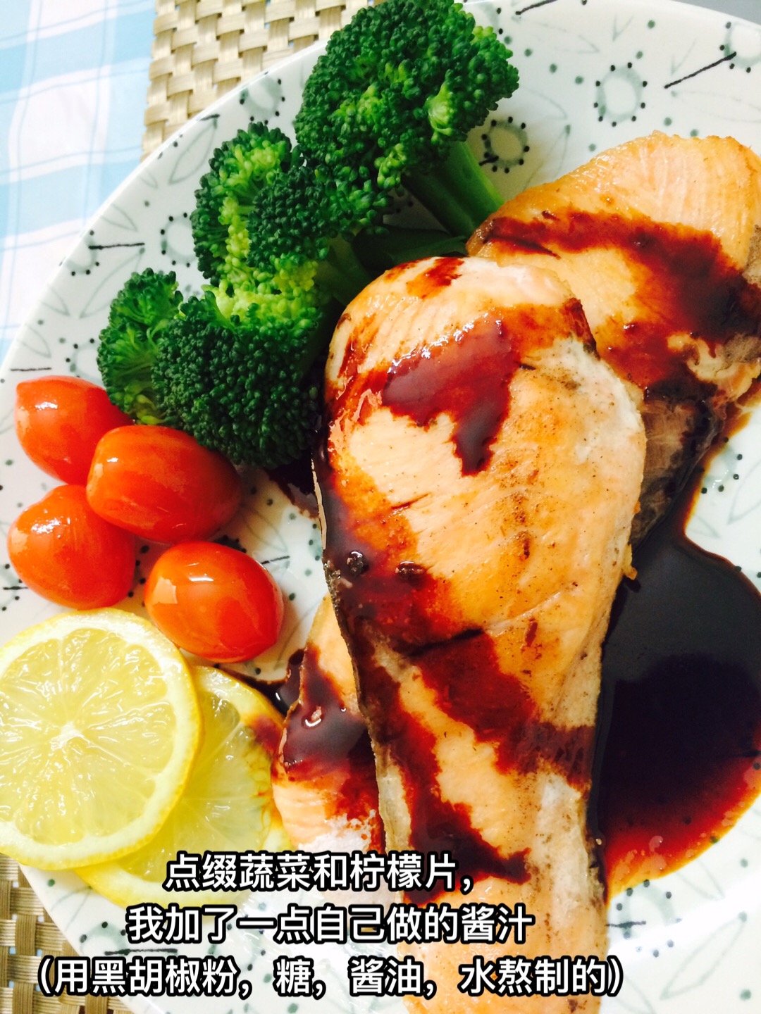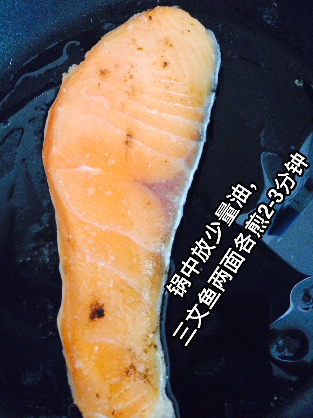 Spread some salt and black pepper powder on salmon steak. Let them stay for several minutes.