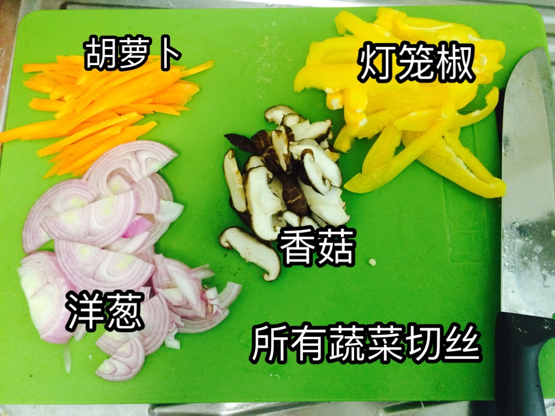 Chop onion, shiitake,bell pepper and carrot into thin slices.