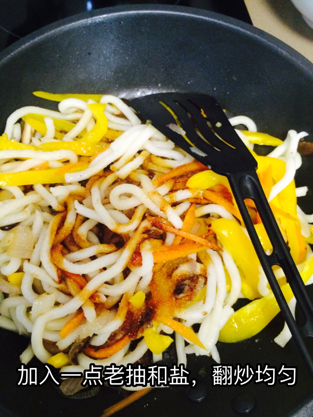 Noodles (I used udon, and noodles should be soaked in water till they get soft.) and bell pepper at last. Stir fry evenly.