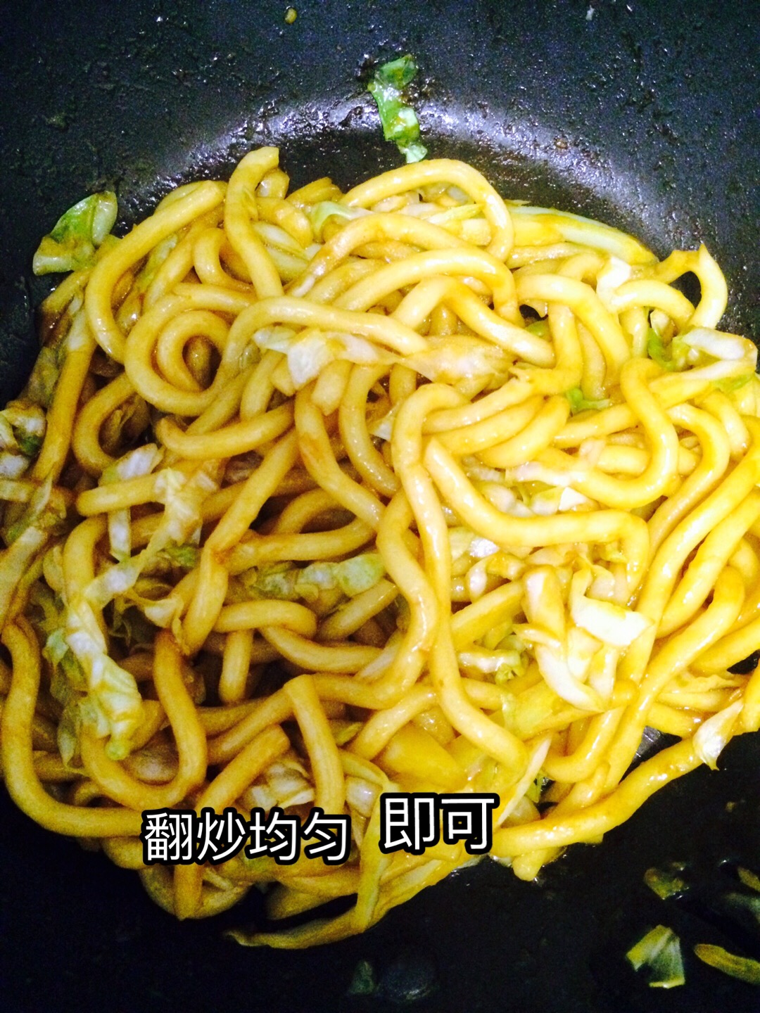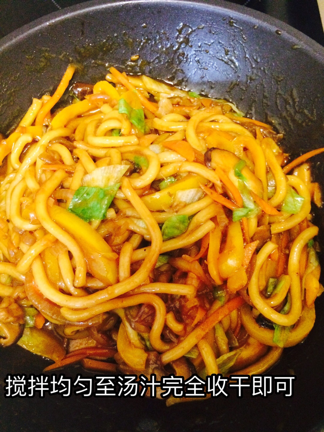 Then add a little water. Because the udon is uncooked, so it should be braised for 2-3 minutes.
