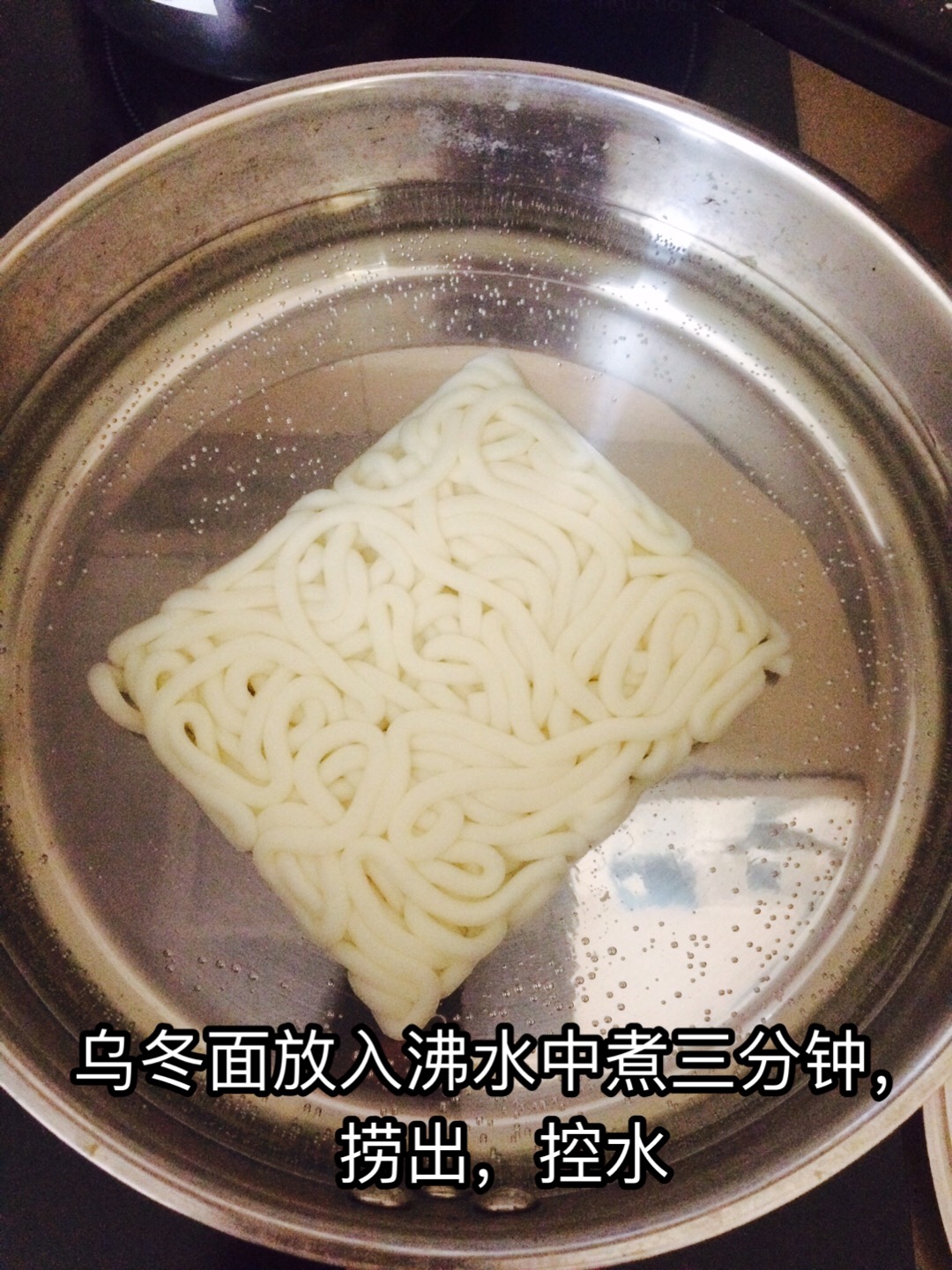 Put udon in boiled water for three minutes. Then ladle them out and drain them.