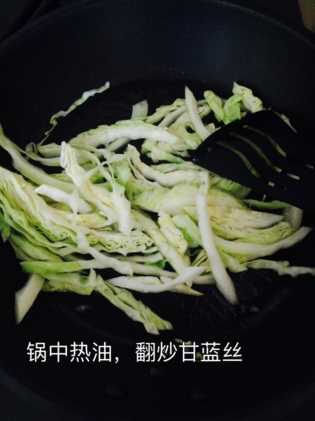 Heat the oil in the pan. Put in cabbage slices. Stir fry for a minute or two.