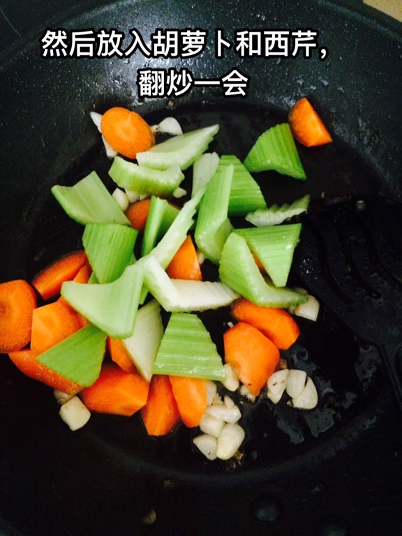 When carrot pieces become soft, add in the canned cream of mushroom. Keep stirring.