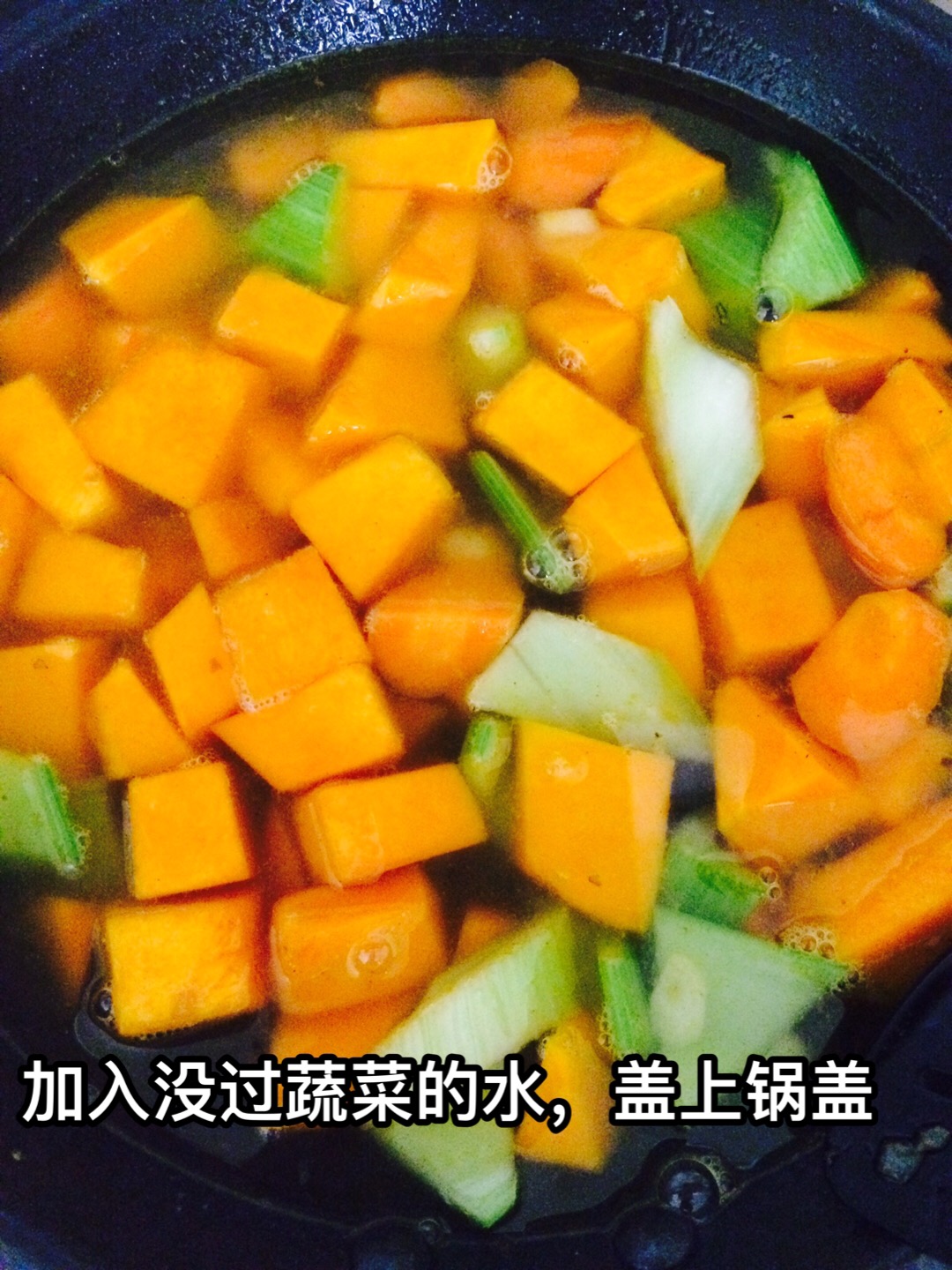 Then add in enough water that covers all the vegetables. Cover the pan with lid.