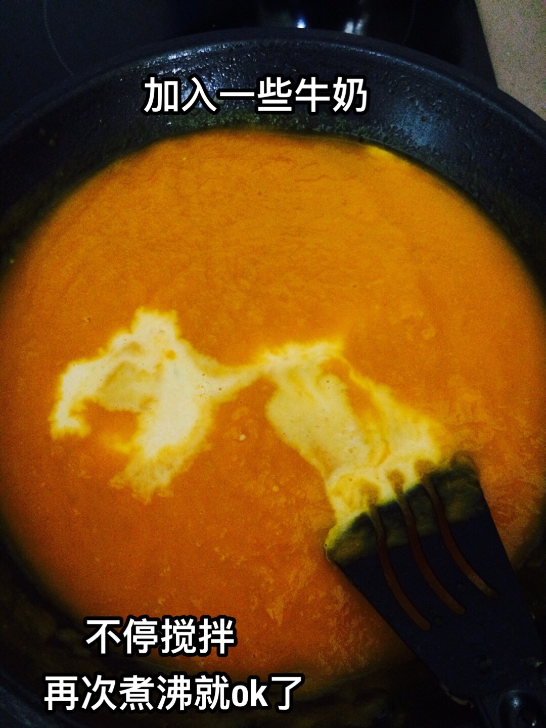 Then add a little milk and salt. Keep stirring. It will be done once boiled again. After milk added in, the color will become a little lighter.